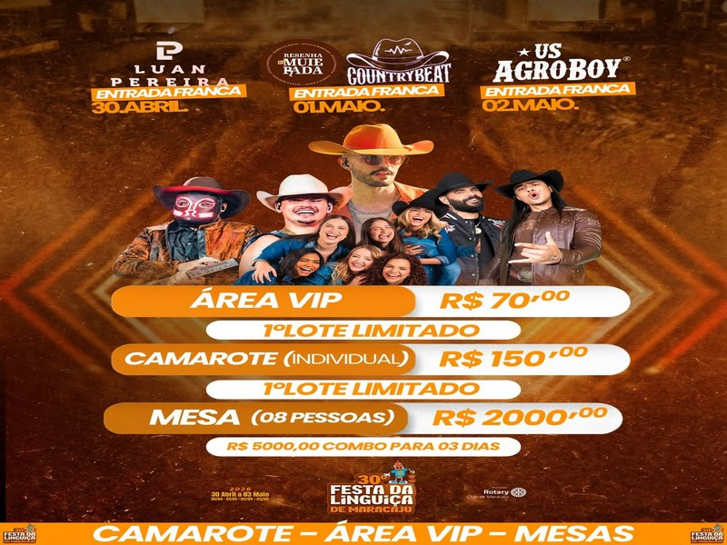 O evento, realizado pelo Rotary Club de Maracaju, acontecerá entre os dias 30 de abril e 03 de maio de 2026. Este ano, a organização reforça o caráter democrático da festa com entrada franca para os shows principais na arena.
