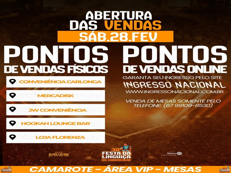 As vendas físicas estarão disponíveis na Conveniência Carlonga, Mercadisk, JW Conveniência, Hookah Lounge Bar e Loja Florenza. Online, os ingressos podem ser garantidos pelo site www.ingressonacional.com.br. Já a reserva de mesas é feita exclusivamente pelo telefone (67) 99109-8530.