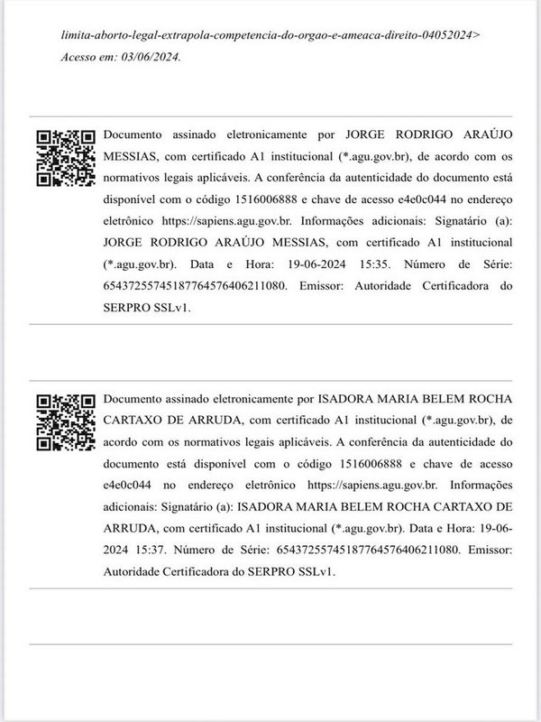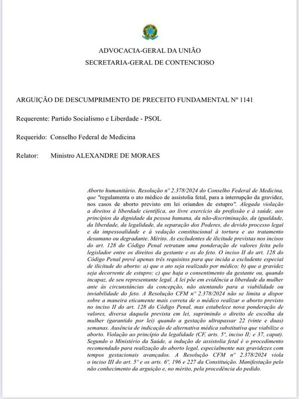 As imagens divulgadas por Moro apresentam trechos do parecer da Advocacia-Geral da União encaminhado ao STF em 19 de junho de 2024. O documento, assinado eletronicamente por Jorge Messias e pela adjunta Isadora Cartaxo de Arruda, sustenta que a Resolução 2.378/2024 do CFM, que limitava o procedimento de assistolia fetal, “extrapolava a competência do órgão” e restringia direitos previstos no Código Penal nos casos de aborto já autorizados por lei, como gravidez resultante de estupro.