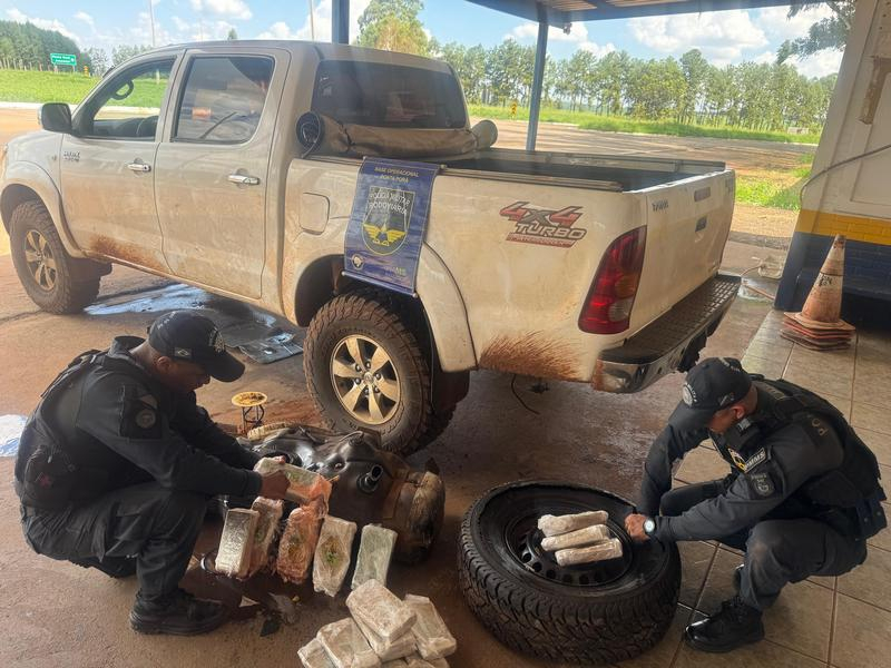 Na vistoria, os policiais identificaram alterações no estepe do veículo, que apresentava peso incompatível. Ao realizar a abertura, foram localizados tabletes de substância análoga à pasta base de cocaína. Em continuidade à fiscalização, também foi constatada adulteração no tanque de combustível, onde foram encontrados mais tabletes do entorpecente.