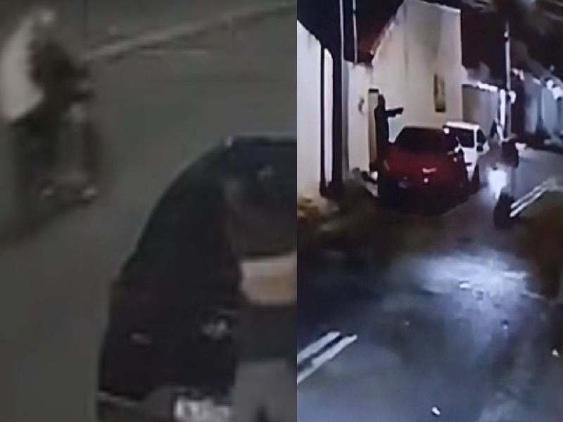 O suspeito que aparece nas imagens demonstra estar ‘aguardando’ o momento ideal de realizar os disparos. Segundos depois, a vítima surge e inicia-se a troca de tiros.