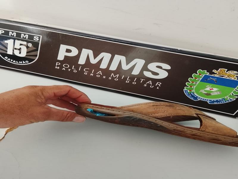 Durante a busca pessoal realizada pela PM, os policiais descobriram que o suspeito utilizava um compartimento oculto em seu chinelo para transportar entorpecentes. No local, foram encontrados 12 papelotes de crack (1,5g).
