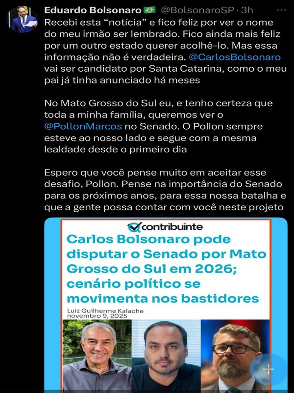 O deputado federal Eduardo Bolsonaro (PL-SP) compartilhou em suas redes sociais, na quarta-feira (12), uma matéria publicada pelo Jornal Contribuinte sobre uma possível articulação para que o vereador Carlos Bolsonaro (PL-RJ) dispute o Senado por Mato Grosso do Sul.