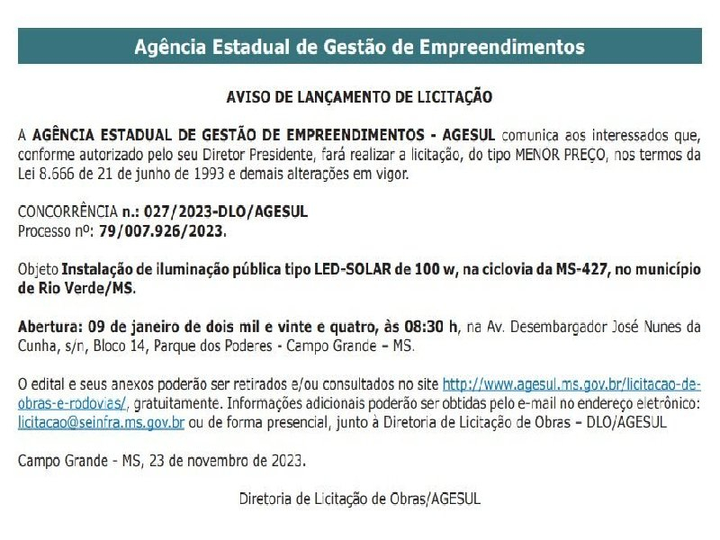 De acordo com o Aviso de Lançamento de Licitação da Agência Estadual de Gestão de Empreendimentos publicado no Diário Oficial Eletrônico n. 11.327 (página 118), foi aberta a CONCORRÊNCIA nº 027/2023-DLO/AGESUL Processo nº: 79/007.926/2023. Objeto: Instalação de iluminação pública tipo LED-SOLAR de 100 w, na ciclovia da MS-427, no município de Rio Verde/MS. Abertura: 09 de janeiro de dois mil e vinte e quatro, às 08:30 h, na Av. Desembargador José Nunes da Cunha, s/n, Bloco 14, Parque dos Poderes - Campo Grande – MS. O edital e seus anexos poderão ser retirados e/ou consultados no site http://www.agesul.ms.gov.br/licitacao-deobras-e-rodovias/, gratuitamente. Informações adicionais poderão ser obtidas pelo e-mail no endereço eletrônico: licitacao@seinfra.ms.gov.br ou de forma presencial, junto à Diretoria de Licitação de Obras – DLO/AGESUL.