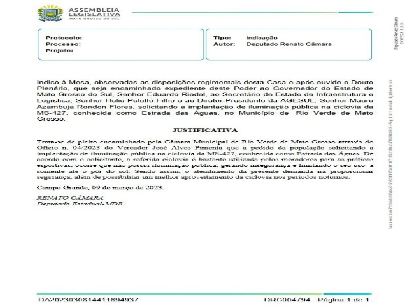 Além da autorização feita pelo governador Eduardo Riedel, a futura obra tem as chancelas do secretário de Estado de Infraestrutura e Logística Hélio Peluffo Filho e do diretor-presidente da AGESUL, Mauro Azambuja Rondon Flores, para os quais Renato Câmara também endereçou a sua Indicação.