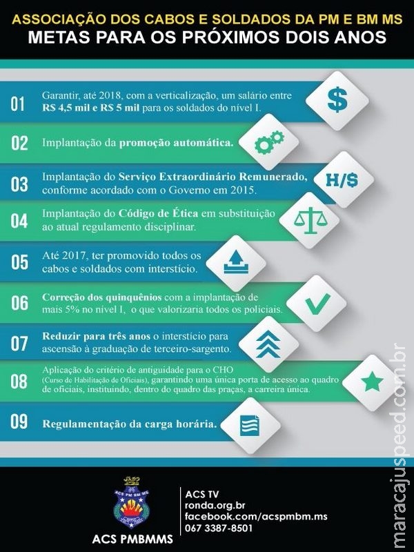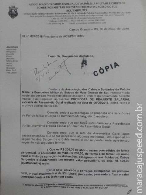 O pleito é discutido desde o ano passado pelo Governo e os comandantes-gerais da Polícia Militar e do Corpo de Bombeiros, e foi reforçado este ano pela ACS (Associação de Cabos e Soldados da Polícia Militar e Bombeiro Militar de Mato Grosso do Sul), via ofício, após assembleia no dia 4 de maio.