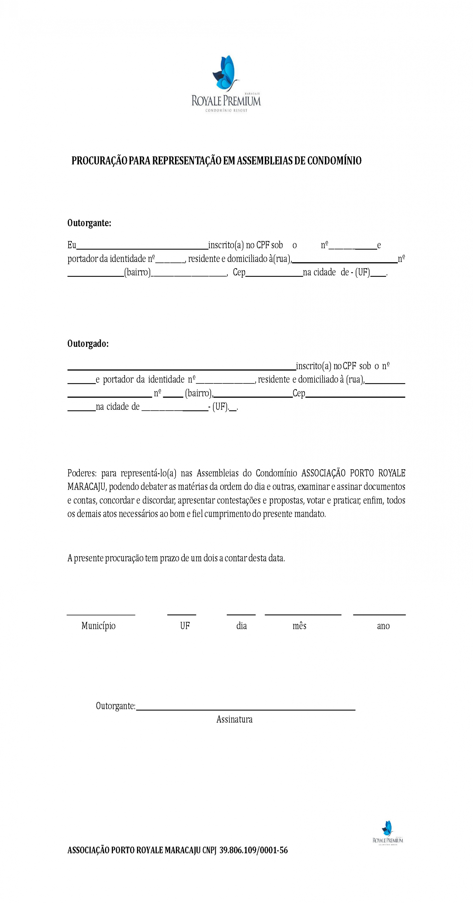 Por determinação estatutária e em conformidade com os artigos 35º e 36º do Estatuto Social, convocamos Vossa Senhoria para a Assembleia Ordinária da ASSOCIAÇÃO PORTO ROYALE MARACAJU, devidamente inscrita no cadastro nacional da Pessoa Jurídica sob o nº CNPJ 39.806.109/0001-56, localizada na Av. Brasil Paraguai, 520 - Alto Maracaju, Maracaju - MS, CEP 79150-000 Maracaju/MS. A referida assembleia realizar-se-á no dia 13 de março de 2026, sexta-feira, no Salão de Festas do Residencial Porto Royale, em Maracaju/MS.