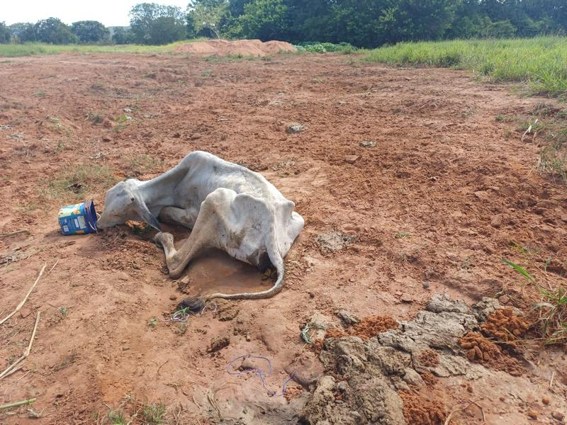 Além do quadro clínico crítico, o bovino estava exposto diretamente ao sol, sem qualquer sombreamento, e não tinha acesso a água ou alimentação adequada, o que evidenciava o total abandono dos cuidados básicos de bem-estar animal.