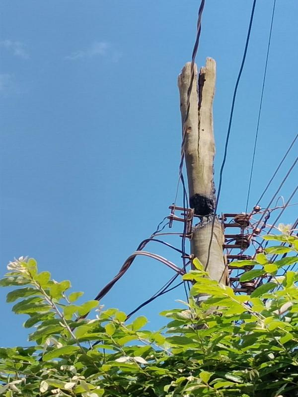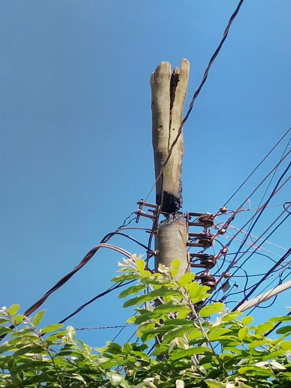 Devido à queima da estrutura, a parte superior do poste de madeira ficou gravemente danificada. Utilizando um caminhão com cesto aéreo, os técnicos da Energisa removeram a parte comprometida para evitar um acidente maior.