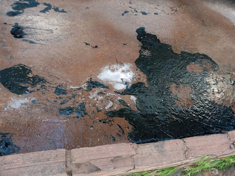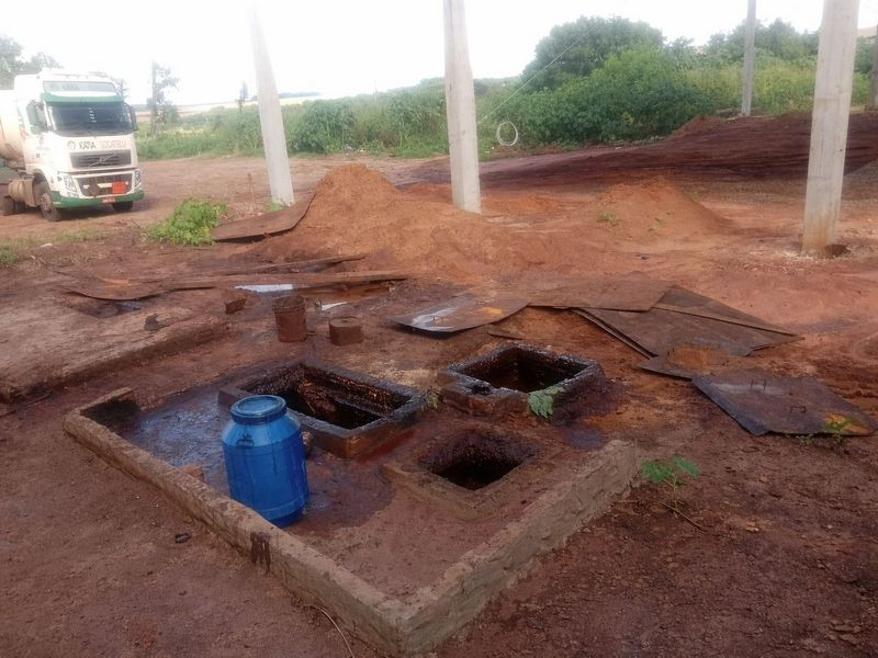 Durante a vistoria no local, foram identificados sinais de extravasamento de substância potencialmente poluidora, caracterizada como petróleo in natura. Constatou-se, ainda, que o sistema de tratamento, composto por caixas separadoras de água e óleo, encontrava-se em condições precárias de funcionamento, em desacordo com a legislação ambiental vigente. Em razão de precipitação pluviométrica recente, houve o transbordamento dessas estruturas, ocasionando o carreamento e a infiltração de significativa quantidade de produto poluente no solo, com a presença de manchas oleosas em área de terra exposta.