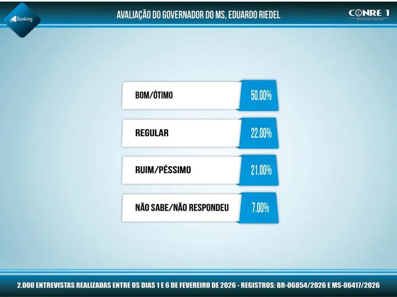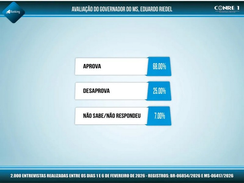 O levantamento foi realizado pelo Instituto Ranking Brasil Inteligência entre os dias 1º e 6 de fevereiro de 2026, com 2.000 eleitores de 16 anos ou mais em 30 municípios de Mato Grosso do Sul.