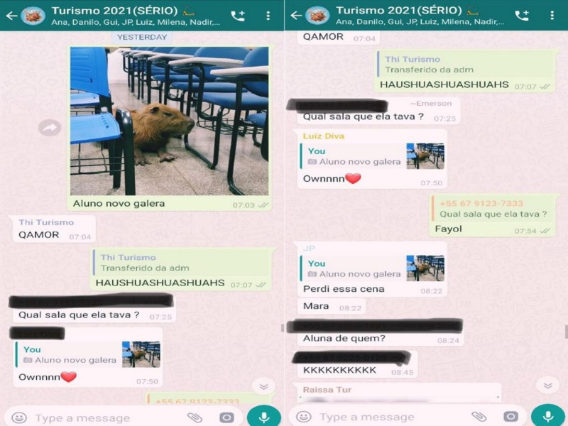 "Aluno novo galera". Três minutos após chegar na Universidade Federal de Mato Grosso do Sul (UFMS), em Campo Grande, é com uma foto e esta legenda que a acadêmica de turismo, Gabriella Emy Oguro, de 22 anos, contou para os colegas o encontro inesperado que teve, ao se deparar com uma capivara na sala de aula, nessa terça-feira (12). Do grupo de WhatsApp, a foto passou a ser compartilhada e viralizou nas redes sociais.